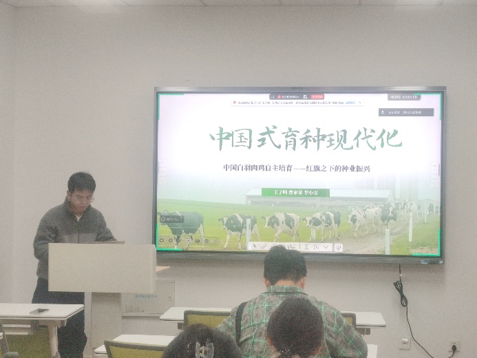 曾家荣代表小组从中国式育种现代化的角度以“中国白羽肉鸡自主培育——红旗之下的种业振兴”为题,从种业振兴的时代号召、红色引领育种现代化等四个方面进行了系统化的讲解。他号召支部党员要将个人理想与学术追求锚定于种业振兴的伟大征程,矢志强农报国以青春热血践行时代担当,于短暂三载中躬身育种实践,在实干中锤炼过硬本领,积极融入畜牧业产学研融合的现代产业体系,力求有所作为。