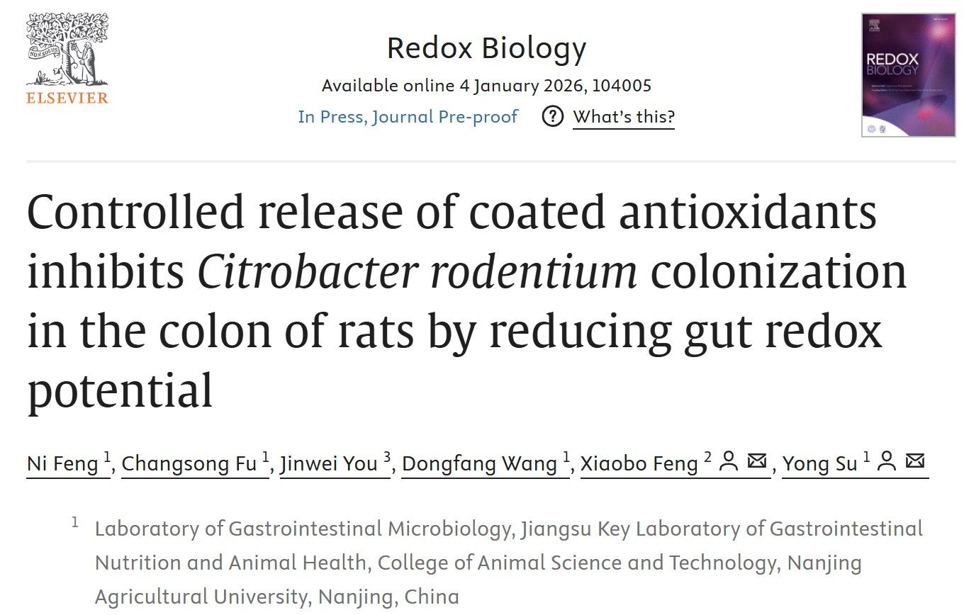 1月4日,我院消化道微生物团队苏勇教授联合东部战区总医院冯啸波主任在国际期刊《Redox biology》发表了题为“Controlled release of coated antioxidants inhibits Citrobacter rodentium colonization in the colon of rats by reducing gut redox potential”的研究论文。该研究表明,采用包被缓释策略可使抗氧化剂精准调控大鼠结肠内氧化还原电位,并进一步重塑肠道菌群抑制柠檬酸杆菌(Citrobacter rodentium)在结肠中定植。