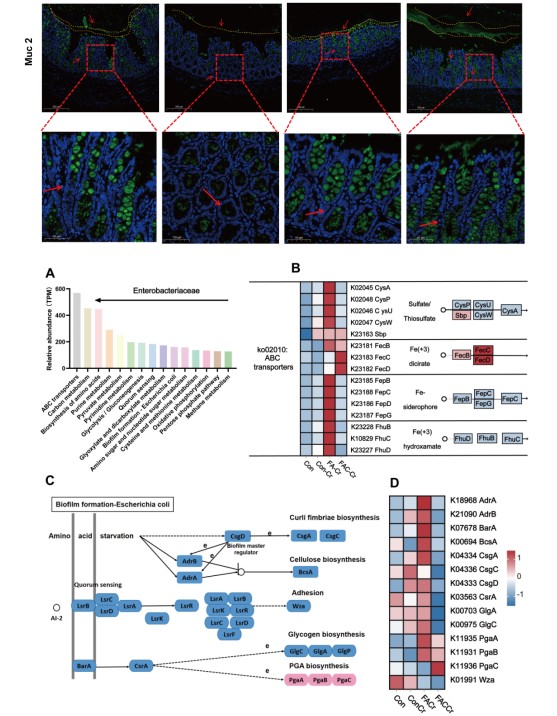 包被FA不仅显著降低肠道氧化还原电位水平,也破坏肠杆菌科细菌的肠道内生态位适应能力。在机制上,包被FA抑制肠杆菌科生物膜形成及ABC转运系统的功能,促进Lactobacillus reuteri的富集,并增强肠道Muc2基因的表达。通过体外共培养表明,在低氧化还原电位体系下,Lactobacillus reuteri对Citrobacter rodentium的生长及其毒力基因(tir、ler)的表达具有更显著的抑制作用。这提示维持肠道氧化还原平衡对微生物群-黏膜相互作用及抵抗病原菌感染至关重要。