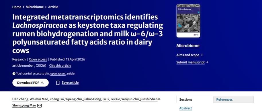 近日,南京农业大学动物科技学院毛胜勇教授团队在《Microbiome》期刊在线发表了题为“Integrated metatranscriptomics identifies Lachnospiraceae as keystone taxa regulating rumen biohydrogenation and milk ω-6/ω-3 PUFA ratio in dairy cows”的研究论文。该研究系统解析了奶牛瘤胃微生物影响乳脂中ω-6/ω-3 多不饱和脂肪酸(PUFA)比值的机制,鉴定出关键调控菌群Lachnospiraceae,为通过瘤胃微生物组干预乳品质提供了科学依据。