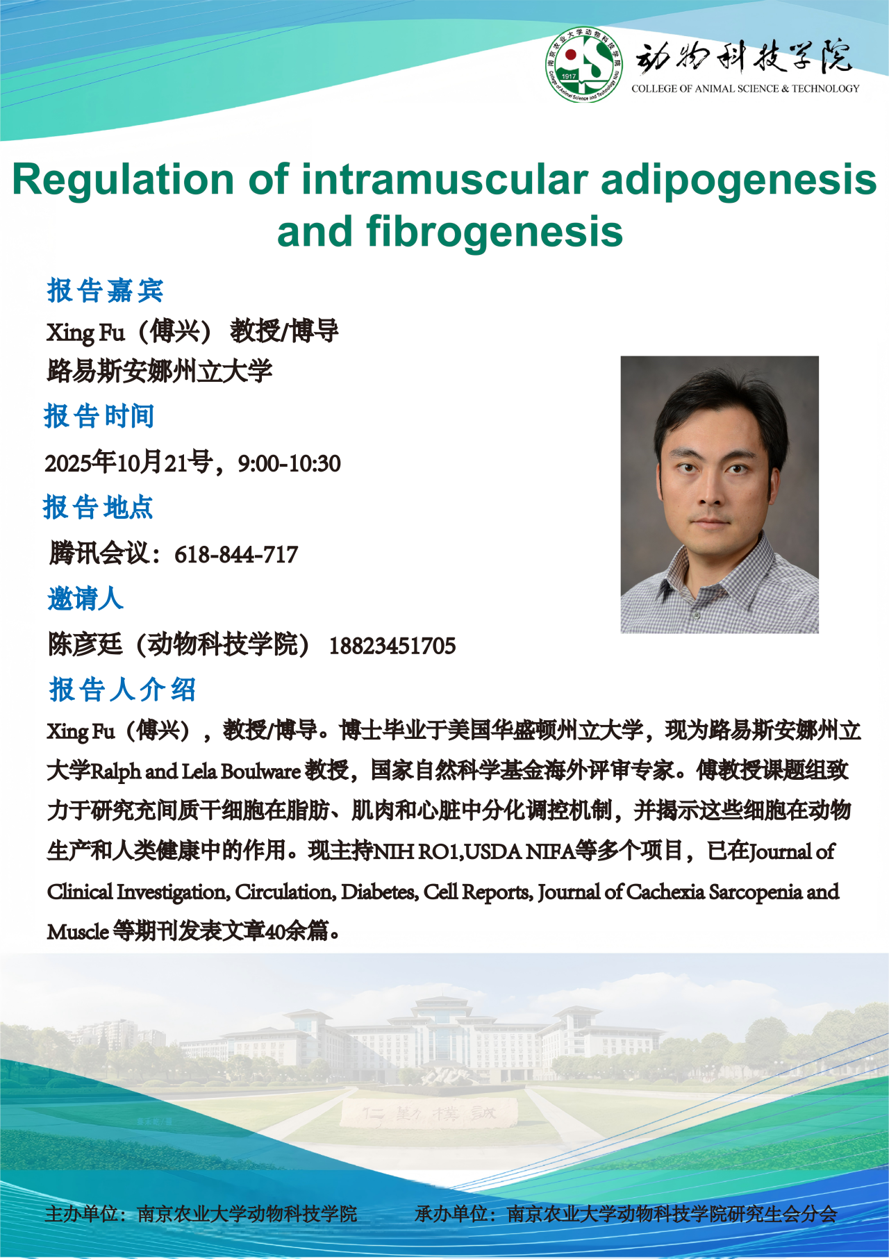 2025年10月21日9:00,路易斯安那州立大学傅兴教授将带来“Regulation of intramuscular adipogenesisand fibrogenesis”专题报告。带你解锁肌内脂肪与纤维生成的最新密码!欢迎师生云端相聚,共话科研新思路!