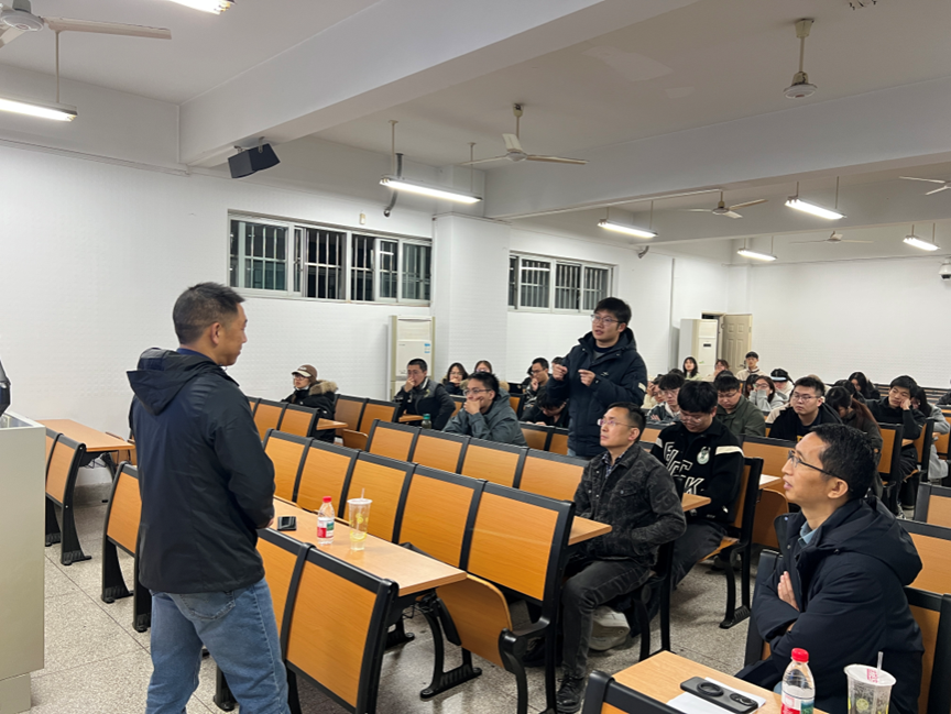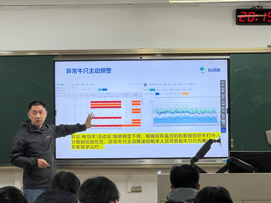 在互动环节,现场同学们踊跃提问,气氛热烈。有同学围绕“智能项圈在实际生产中是否会出现被牛只撕咬、影响使用寿命”等细节问题进行了请教。针对这一问题,朱红宾总经理肯定了同学的观察视角,并耐心作出回应。他指出,奶牛一般不会出现主动撕咬项圈的情况,但在羊等其他反刍动物应用场景中,确实会面临类似挑战。为此,科湃腾团队一方面不断改进项圈材料与工艺,提高其耐磨、耐拉、耐咬性能;另一方面通过结构优化和耐候性设计,延长整机使用寿命,在保障数据采集连续性的同时,尽可能降低维护和更换成本。这一回答不仅体现了前沿技术在落地应用中的复杂性,也折射出企业对产品可靠性和用户实际需求的持续关注与迭代努力。