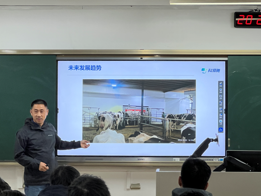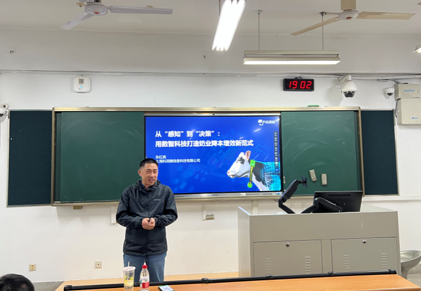 11月22日晚,2025“现代奶牛生产与饲养管理”专业学位公开课暨规模化牧场奶牛健康养殖技术培训第六期在南京农业大学卫岗校区教学楼A206举行。活动由南京农业大学研究生院、动物科技学院主办,反刍动物营养与清洁化生产中心和动物科技学院研究生会分会承办,申军士副教授主持。南农杰出校友、上海科湃腾信息科技有限公司总经理朱红宾受邀作题为“从‘感知’到‘决策’:用数智科技打造奶业降本增效新范式”的报告,与师生分享奶业数字化转型的实践经验与思考。