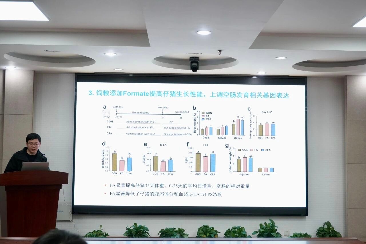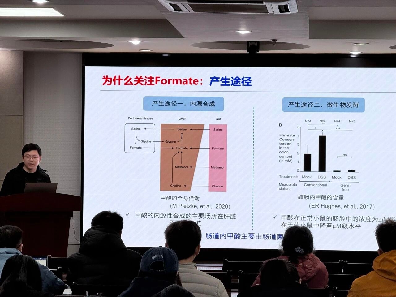 余凯凡教授在报告中指出,肠道微生物代谢产物是微生物与宿主互作的核心媒介,其中Formate作为关键代谢物,在维系仔猪小肠健康中发挥重要作用。他介绍,前期研究发现仔猪小肠内Formate呈现高水平特征,推测这一现象源于小肠内甲酸产生菌相对丰富,而甲酸利用菌占比偏低,这一菌群结构特点为甲酸在局部积累并发挥生物学功能创造了必要条件。